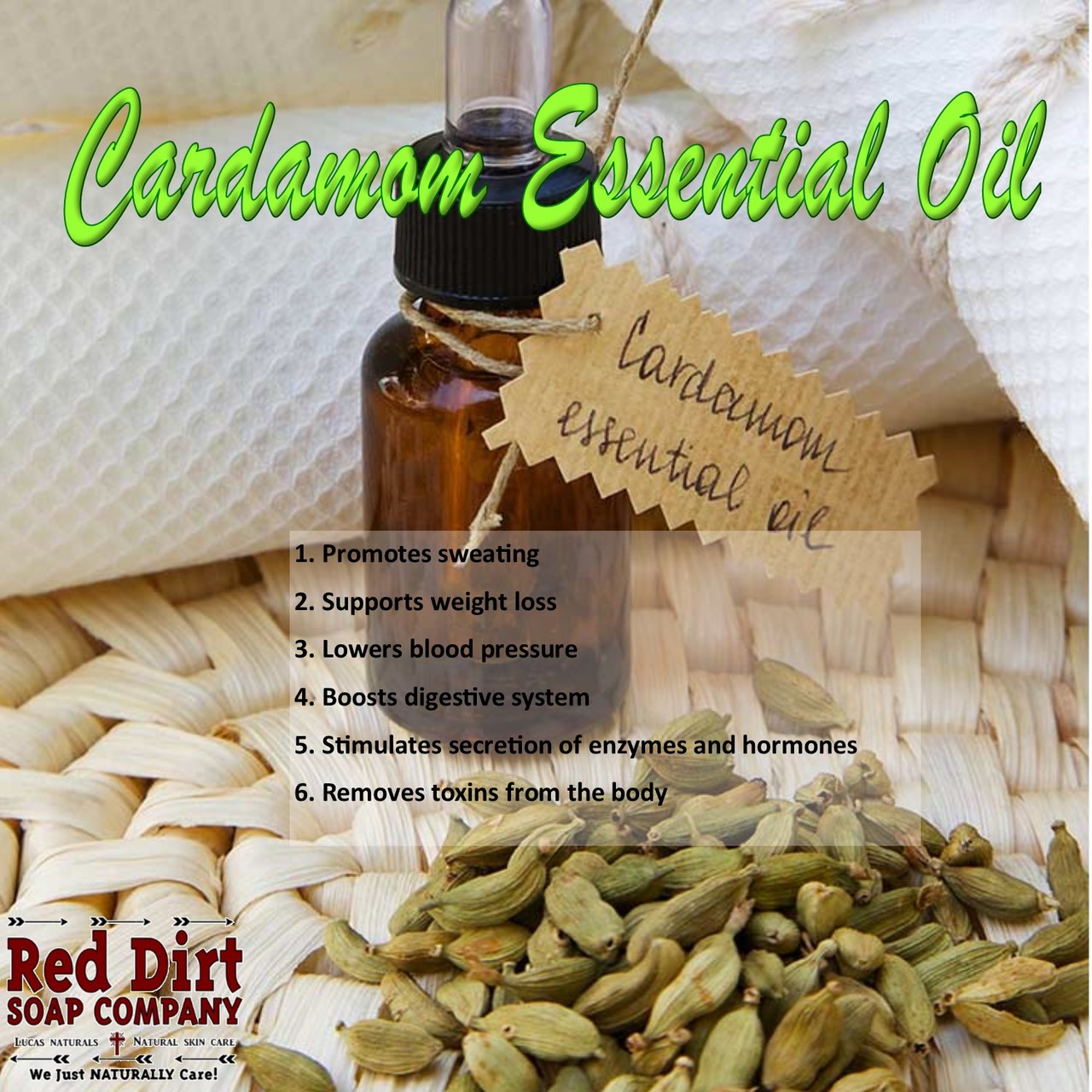 Cardamom essential oil stimulates your entire system. This stimulating effect also boosts your spirits in cases of depression or fatigue. It also stimulates the secretion of various enzymes and hormones, gastric juices, peristaltic motion, circulation, and excretion, thus maintaining proper metabolic action throughout the body.
