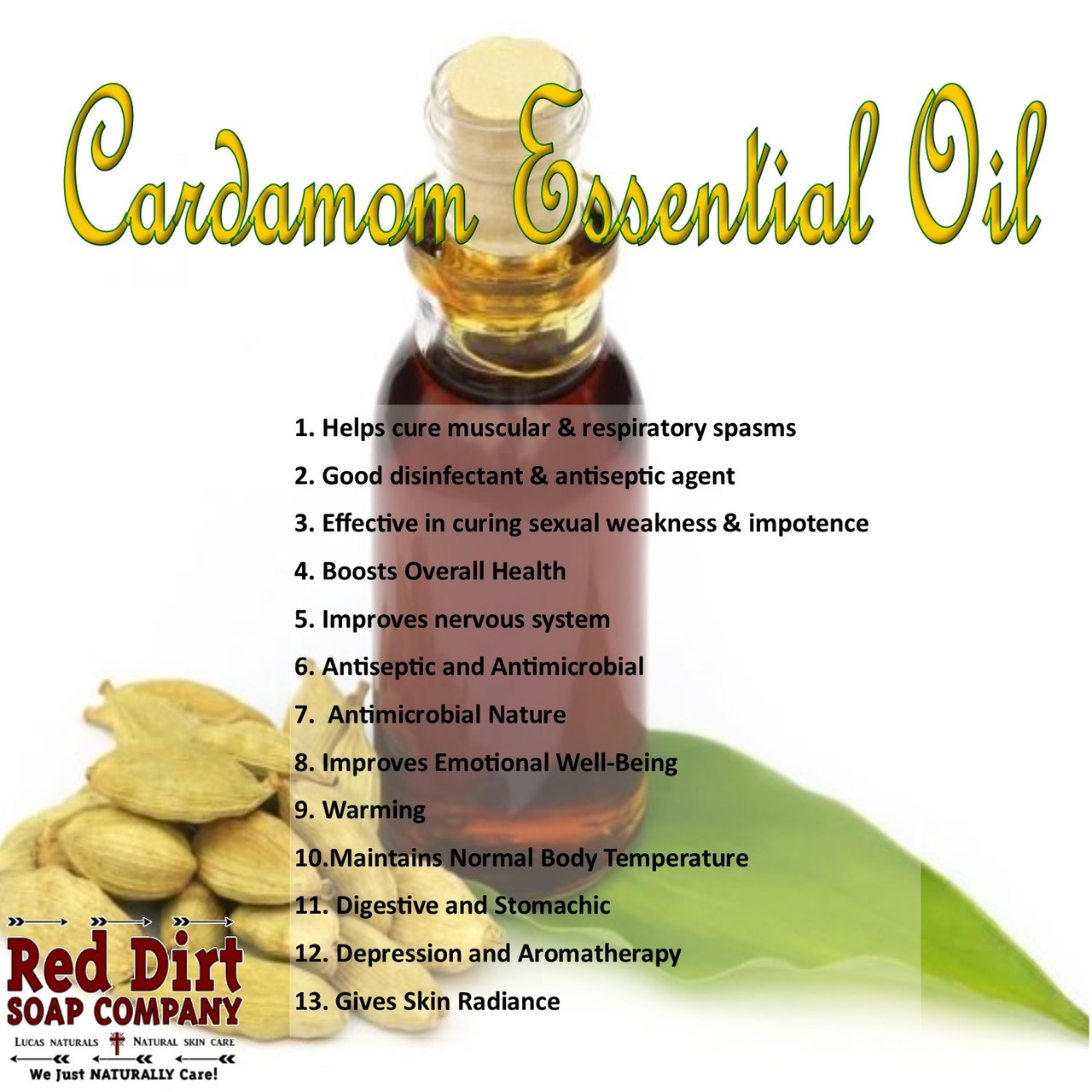 Cardamom oil has an arousing effect that can help cure sexual weakness, erectile dysfunctions, impotence, loss of libido, and frigidity.