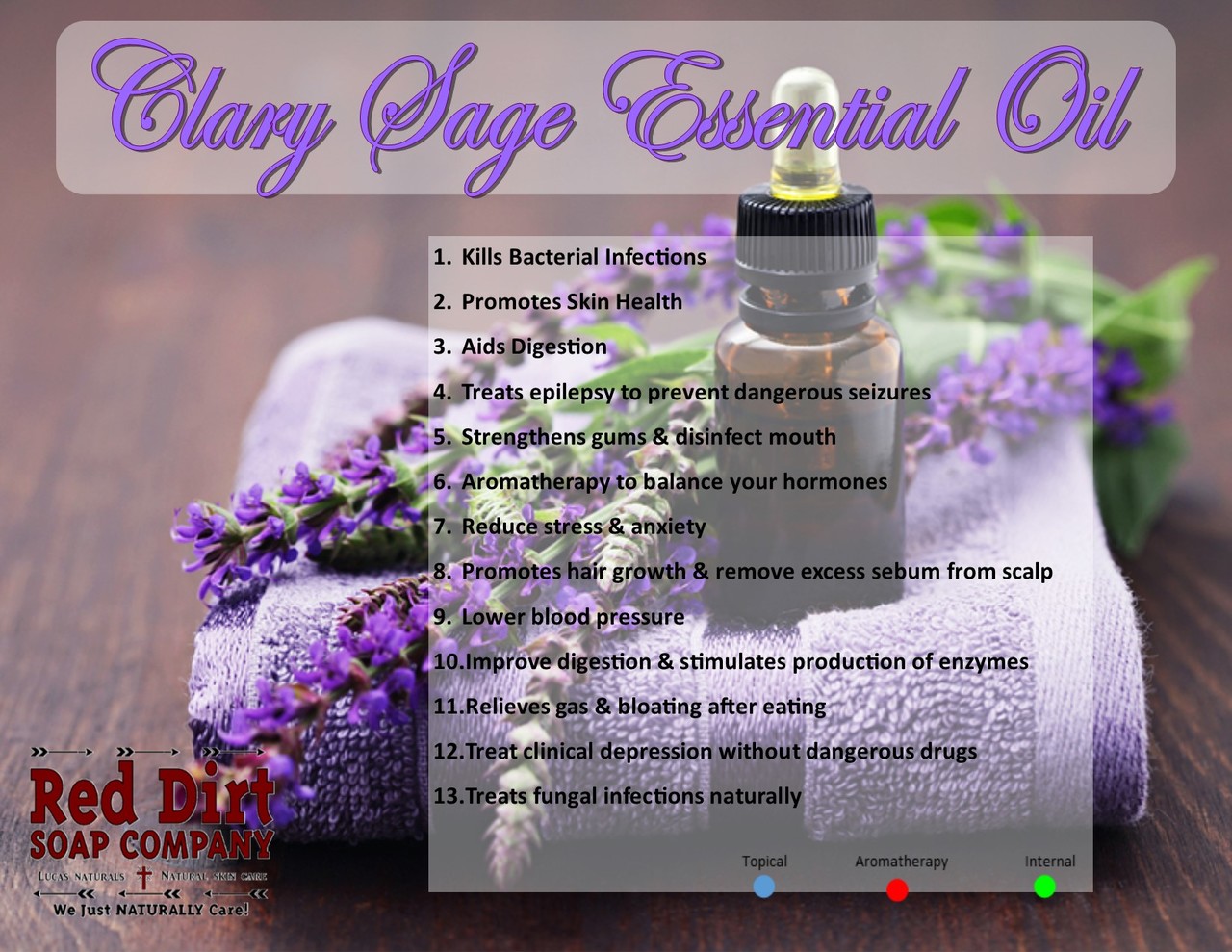 The health benefits of Clary Sage Essential Oil can be attributed to its properties as an antidepressant, anticonvulsive, antispasmodic, antiseptic, aphrodisiac, astringent, bactericidal, carminative, deodorant, digestive, emmenagogue, euphoric, hypotensive, nervine, sedative, stomachic and uterine substance.