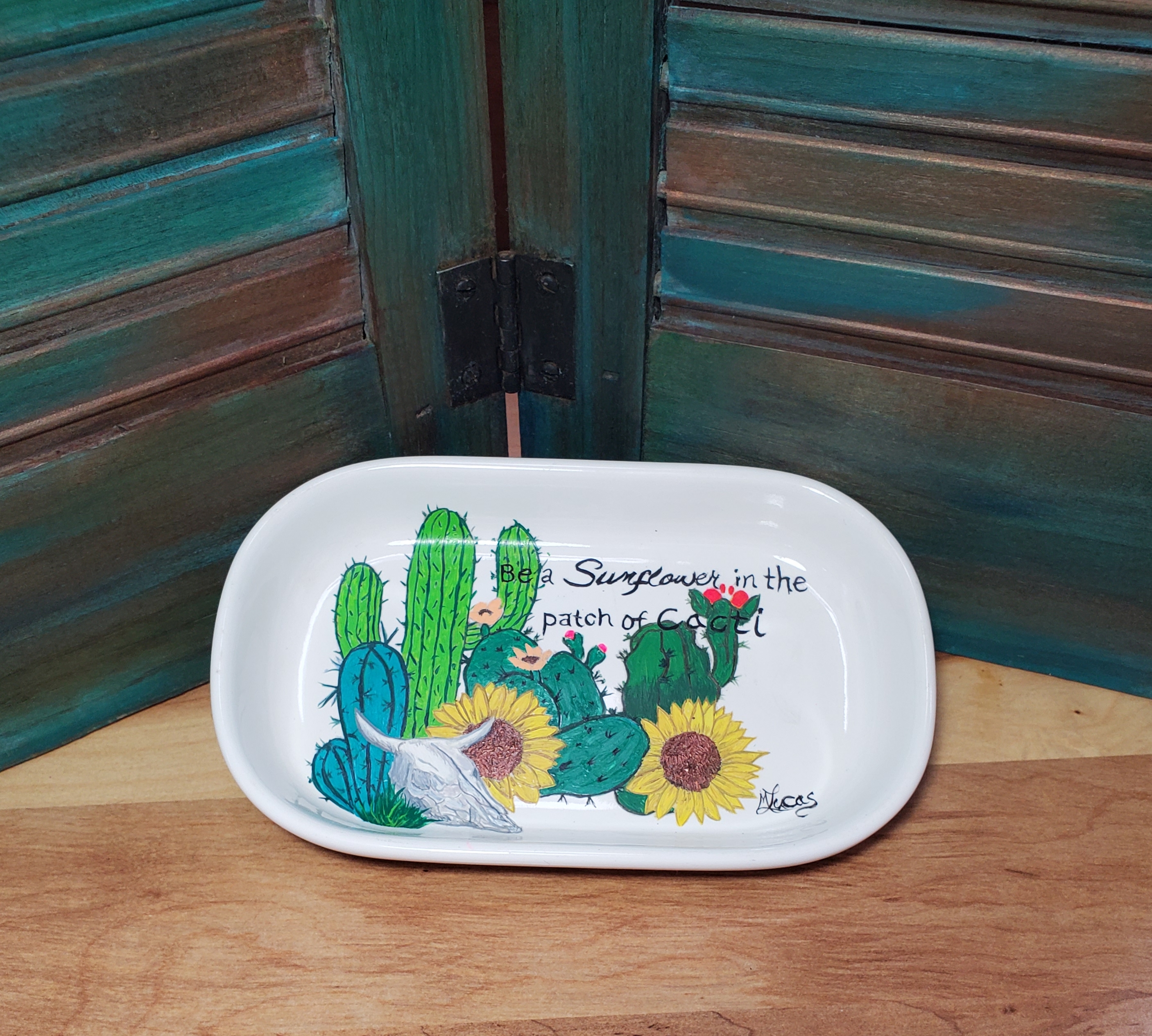 This Super cute soap dish is hand painted with cactus and sunflowers. Oh what a wonderful Combination! "Be a Sunflower in the patch of Cacti!"