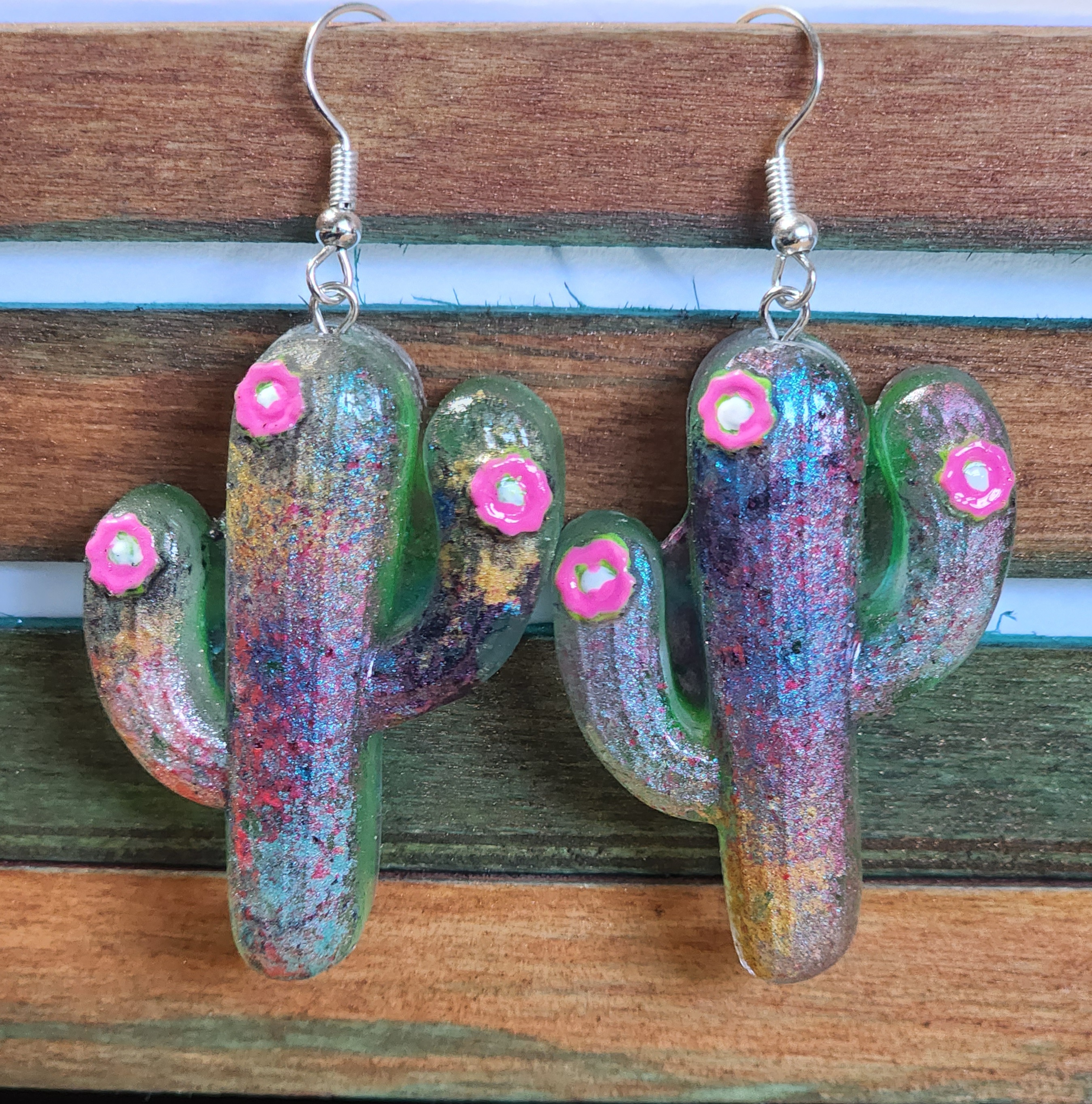Handcrafted resin pink flower cactus earrings. No 2 alike.