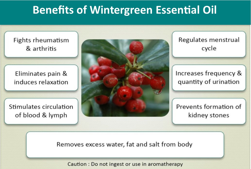 The health benefits of Wintergreen Essential Oil can be attributed to its properties as an analgesic, anodyne, antirheumatic, antiarthritic, antispasmodic, antiseptic, aromatic, astringent, carminative, diuretic, & stimulating substance. The oil of wintergreen is a world famous name, & it is extremely popular with the people suffering from rheumatism, arthritis, gout & pain in their bones & joints from any number of reasons. This oil can usually be found in every household because it has so many common applications. Native Americans who discovered the use of its oil to eliminate pain in the muscles & joints. Some of the ways Wintergreen Essential Oil has helped others is General Muscle Pain, Fibromyalgia & connective tissue pain, Cartilage Injury, Muscle Spasm, Nerve Pain, Headaches, Migraines, Arthritis; Rheumatism, Painkiller, Relaxing for Body; Mind, Detoxify, Antioxidant, Purify Blood, Removes Free Radicals, Removes Gas, Increases Urination, Tightens Gums; Muscles, Anti-Septic, Menstruation, Reduces Hair Loss Analgesic: I doubt that I need to introduce this property of Wintergreen essential oil to anyone, since it is one of the major properties for which it is known around the world. When rubbed on the affected area, this oil is readily absorbed through the skin & the presence of Menthol Salicylate induces numbness & an anesthetic effect on the nerves there. It also increases circulation of the blood & brings warmth to the area. In this way, it fights pain. Wintergreen essential oil will eradicate pain & drive out stress & tension. This is a very pleasant way of getting a sound sleep at the end of the day for those who often lose sleep due to pain or stress.